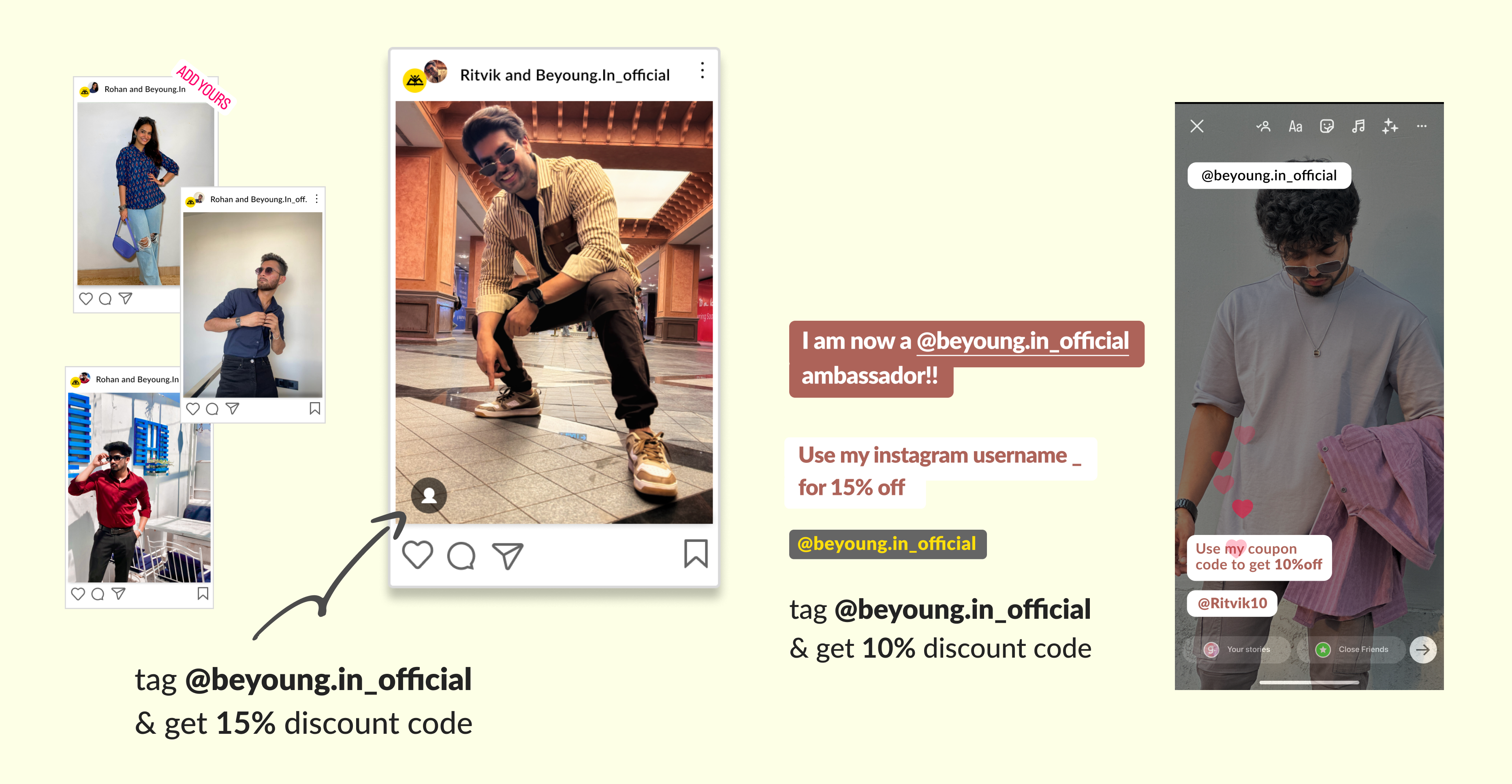 When you mention @beyoung.in_official in your posts and story, and if your content passes the quality check, we collabrote and you get an exclusive 15% site wide discount and we turn your Instagram username into a 10% discount code for your followers.